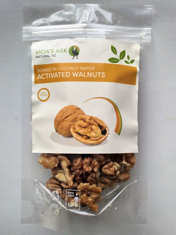 Our Activated Walnuts have a mild sweet crunchy flavour with no bitter taste which makes the Walnuts easy to digest. A wonderful healthy raw snack food alternative when compared to other standard snack foods currently on the market. 70 gram stand-up resealable pack of Moa’s Ark Natural NZ Activated Walnuts. Why Activate? Nuts naturally contain compounds such as Phytic acid that inhibit their growth and make them hard to digest. Soaking our selected Walnuts in our New Zealand Alkaline Hydrogen filtered water mixed with Coconut water and Himalayan salt crystals, activates the nuts into thinking they are about to sprout. Our activating and dehydration process removes natural inhibitors as well as releasing nutrients through germination which makes the seedlings taste fresh and sweet. Moa’s Ark Natural NZ Walnuts contain no natural inhibitors, preservatives and contain no Phytic acid.